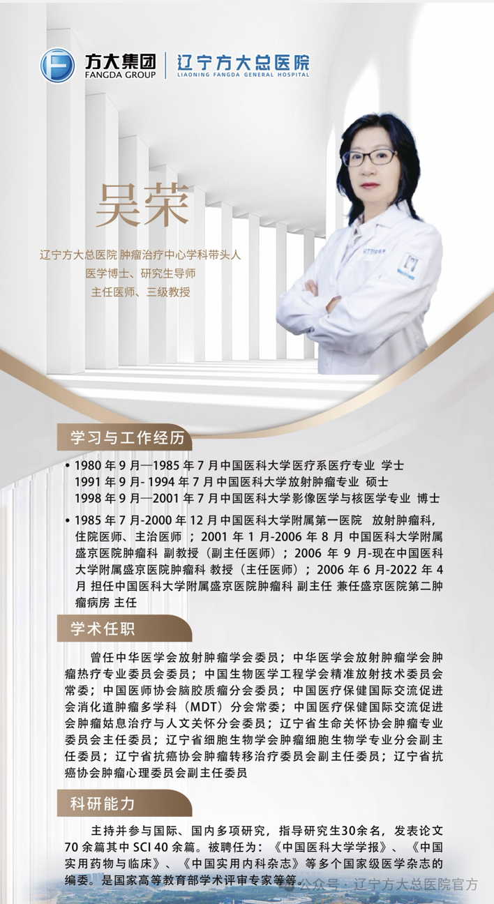 辽宁方大总医院肿瘤综合诊治中心吴荣主任在肿瘤医学领域建树颇丰,曾任中华医学会放射肿瘤学会委员,深度参与行业内学术交流与规范制定;作为中华医学会放射肿瘤学会肿瘤热疗专业委员会委员,积极推动肿瘤热疗技术在临床的应用与发展。尤其是作为中国生物医学工程学会精准放射技术委员会常委,助力精准放射技术不断革新。在辽宁省内,吴荣主任担任辽宁省生命关怀协会肿瘤专业委员会主任委员等职务,引领着区域内肿瘤诊疗技术的提升与行业发展方向。