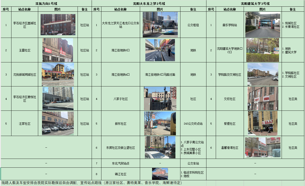 (3)沈阳建筑大学3号线。沈阳音乐学院长青校区始发,途经1个地铁口(沈阳建筑大学地铁口C口)、7个社区(悦城社区、长青湾社区、学院路社区及文溯社区、文欣社区、紫提社区、温馨港湾社区)到达医院,共停靠6个站点,单程约14公里,预计行驶时间50分钟。